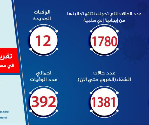 وأوضح الدكتور خالد مجاهد، مستشار وزيرة الصحة والسكان لشئون الإعلام والمتحدث الرسمي للوزارة، أن عدد الحالات التي تحولت نتائج تحاليلها معمليًا من إيجابية إلى سلبية لفيروس كورونا (كوفيد-19) ارتفع ليصبح 1780 حالة، من ضمنهم الـ 1381 متعافيًا.