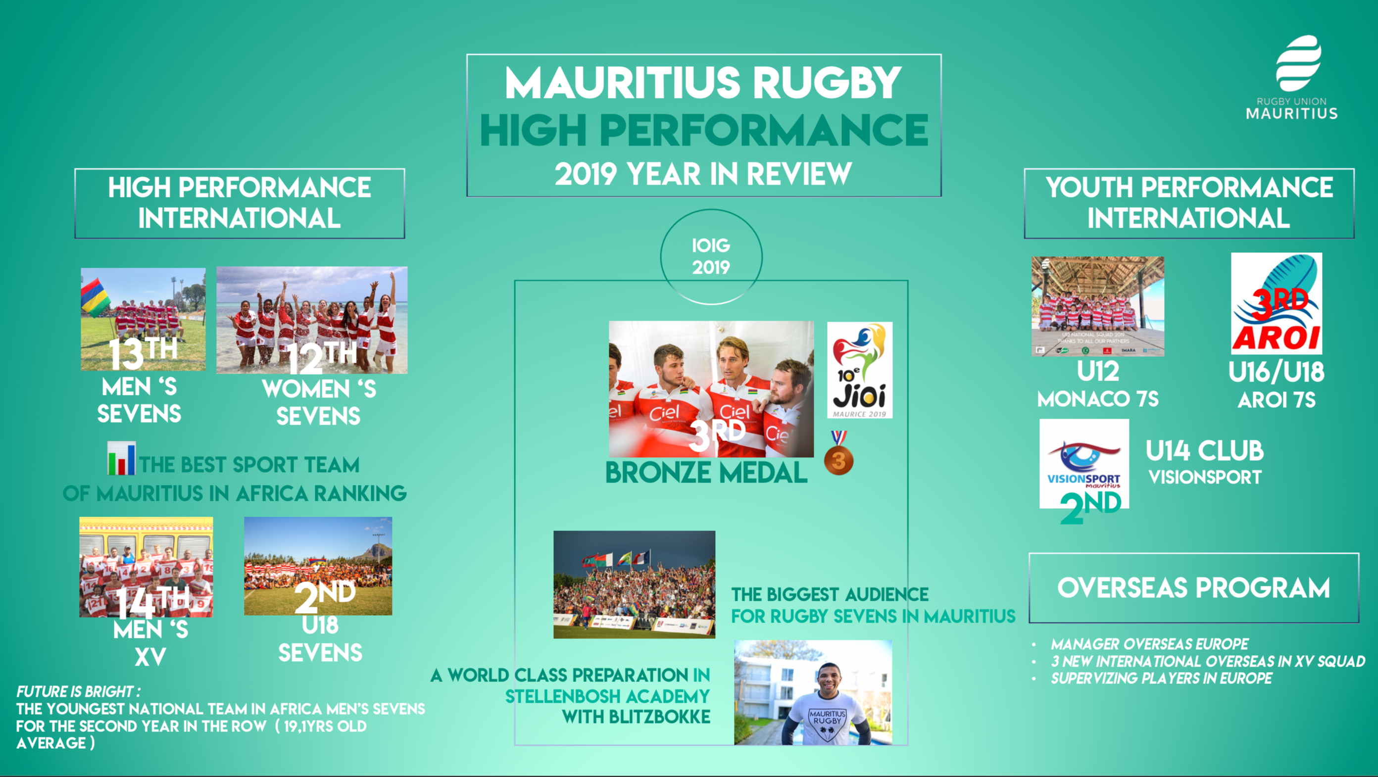 The U18 won the Bronze medal in the AROI tournament involving Madagascar, Reunion and Mayotte as well as a silver medal in the Visionsport tournament between South African and Mauritian teams.
