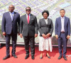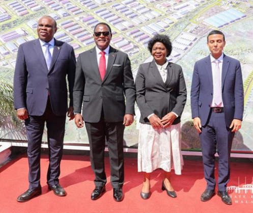 • من اليسار إلى اليمين: البروفيسور بنديكت أوكي أوراما، الرئيس ورئيس مجلس إدارة Afreximbank، فخامة الدكتور لازاروس مكارثي شاكويرا، رئيس جمهورية ملاوي، السيدة الأولى لملاوي، السيدة مونيكا شاكويرا والرئيس المؤسس لـ ARISE IIP، السيد جاغان جوبتا أثناء التكليف الرسمي بوضع حجر الأساس للمنطقة الصناعية "ماجويرو" في ملاوي.