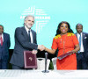 • مارك تابسي، مؤسس ورئيس مجلس إدارة APD الكاميرون (يسار)، يتبادل الوثائق مع هيلين بروم، مديرة المشاريع والتمويل القائم على الأصول في Afreximbank، بعد التوقيع على ورقة شروط إرشادية لتمويل 210 مليون يورو لمحطة ميناء جديدة في دوالا، الكاميرون
