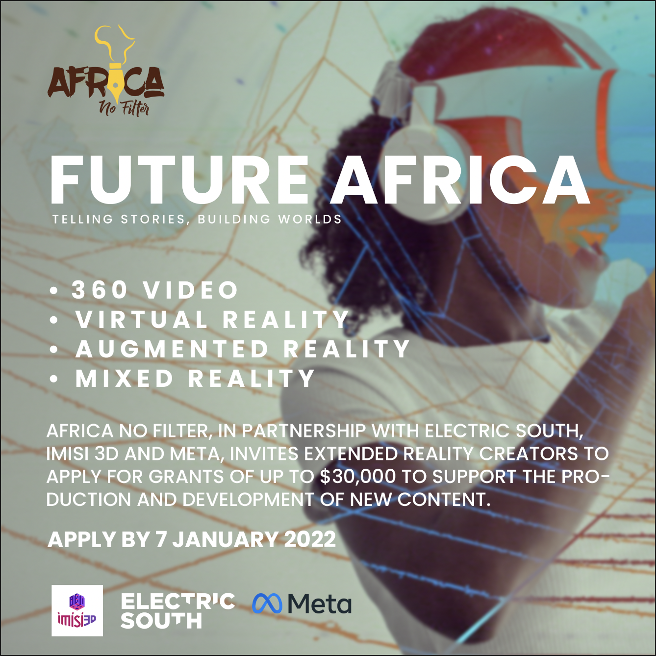 Open from today (https://bit.ly/3lCZ05B), Africa No Filter and Meta are inviting Extended Reality creators to apply to the program, and recieve funding of up to $30,000. Applicants must be of African descent and living in the continent, aged over 18 years, have a track record of XR content creation and have a portfolio of work showing their creativity and innovation.