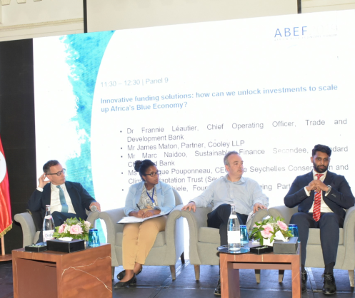 • From left to right: Henry Bonsu, Journalist and broadcaster; Torsten Thiele, Founder and Managing Partner, The Global Ocean Trust; Angelique Pouponneau, CEO, Seychelles’ Conservation and Climate Adaptation Trust (SeyCCAT); James Maton, Partner, Cooley LLP; Marc Naidoo, Sustainable Finance Secondee, Standard Chartered Bank; Dr Frannie Léautier, Chief Operating Officer, Trade and Development Bank (TDB)