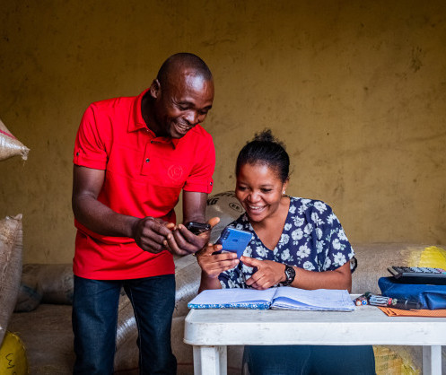 • Akinde Lorluuma, a rice farmer in Nigeria, is delighted by electronic payments via Mobile Banking at the point of purchase | ©IFAD/ Bernard Kalu