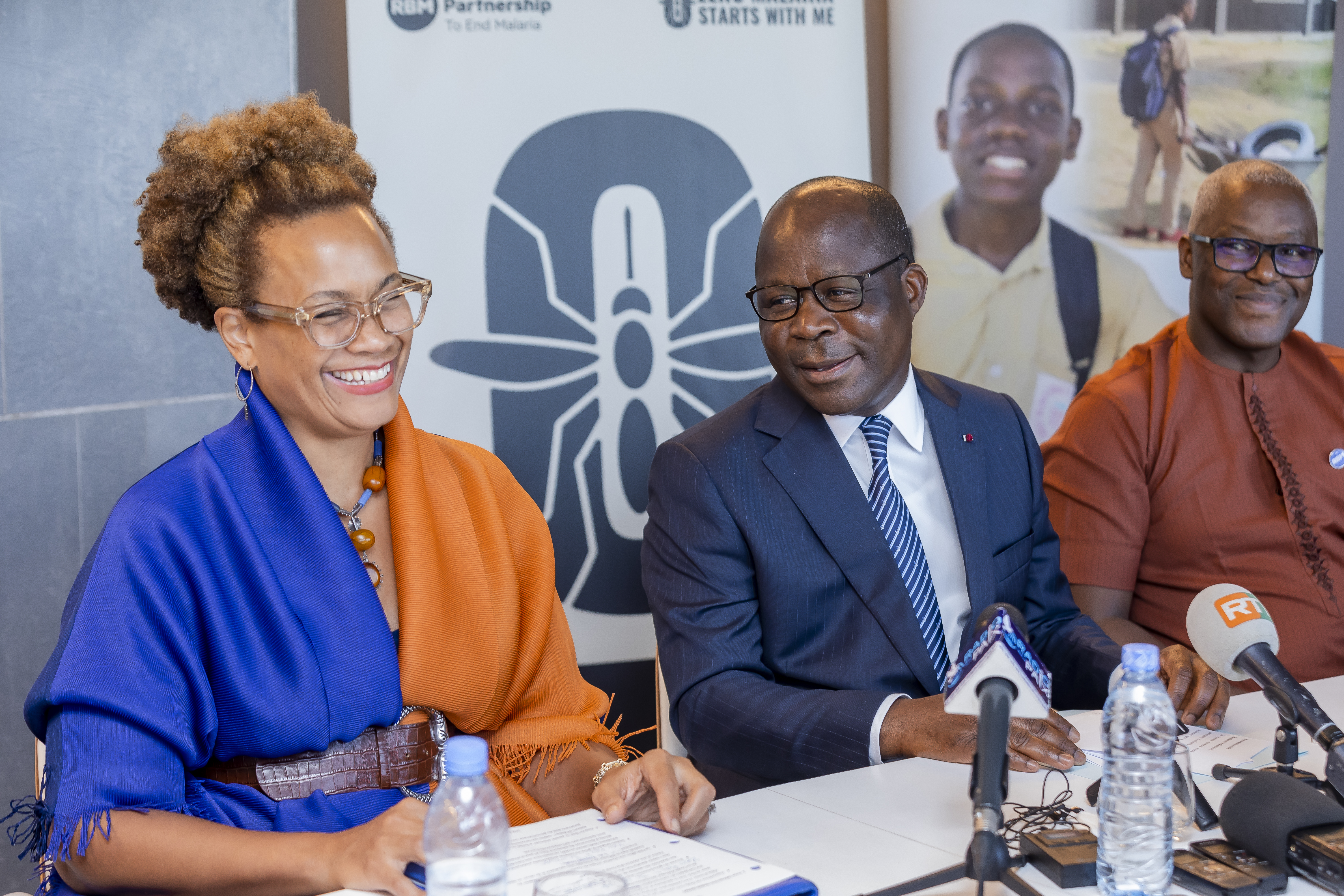 • (E-D) Sua Excelência Jessica Davis Ba, Embaixadora dos Estados Unidos na Costa do Marfim, Pierre N’Gou Dimba, Ministro da Saúde e Higiene Pública da Costa do Marfim, Dr. Michael Adekunle Charles, CEO Parceria RBM para Acabar com a Malária