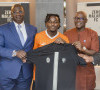 • (E-D) Dr. Antoine Tanoh, Coordenador do Programa Nacional de Controlo da Malária, Didi B, artista internacional e campeão do Zero Malaria FC, Dr. Michael Adekunle Charles, CEO Parceria RBM para Acabar com a Malária