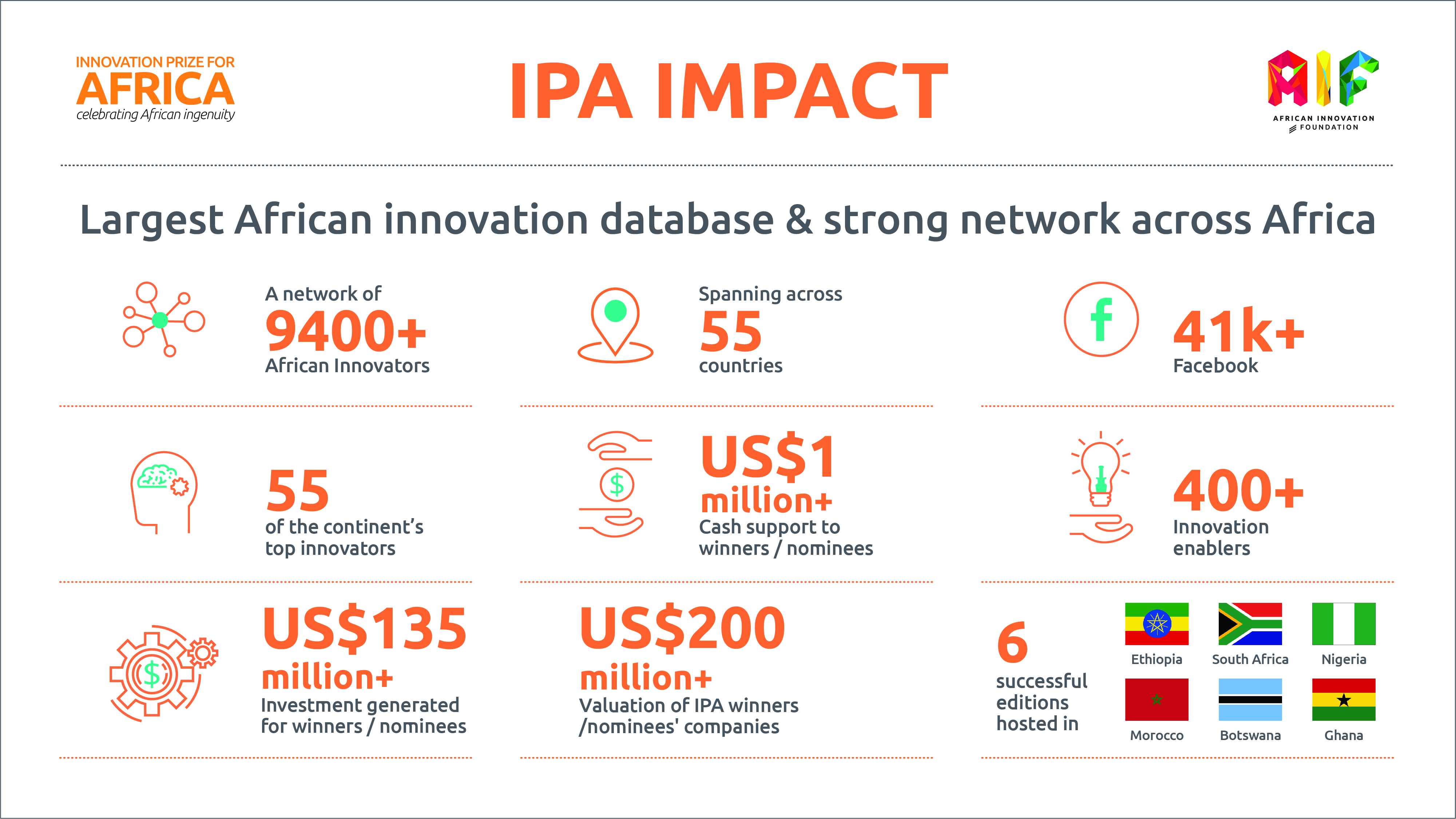 To date, AIF has supported 55 IPA winners/nominees with US$ 1 million+ and mobilized 9 400+ innovators from all 55 African countries