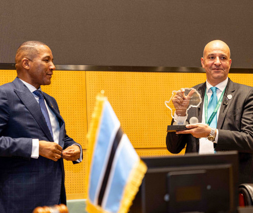 Au cours de la conférence de presse, S.E. le Président Duma Gideon Boko et le Dr Chikwe Ihekweazu, le DGA et directeur régional par intérim du Bureau régional de l'Organisation mondiale de la santé pour l'Afrique (OMS AFRO), ont remis à l'ambassadeur Ashraf Sweilam, ministre adjoint des Affaires étrangères pour les organisations et communautés africaines de la République arabe d'Égypte et représentant personnel du président de la République arabe d'Égypte auprès de l'AUDA-NEPAD, un prix en reconnaissance de cette réalisation, notant que la victoire contre le paludisme est réalisable.