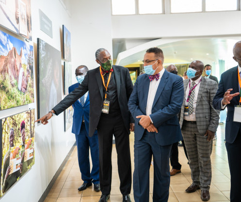 • AWF CEO, Kaddu Sebunya gives a tour of the Benjamin Mkapa African Wildlife Photography exhibition to Cabinet Secretary, Hon Najib Balala and PS – Professor Fred Segor