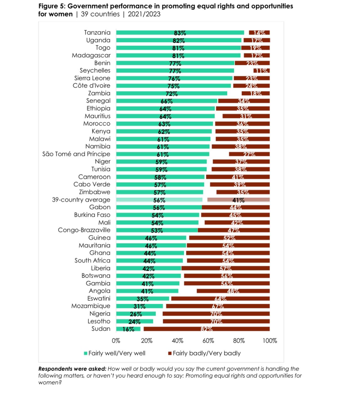 • Figure 5 : Performance du gouvernement dans la promotion de l’égalité des droits et des chances pour les femmes | 39 pays | 2021/2023