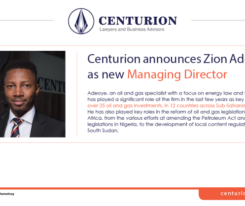 Zion Adeoye has been named Managing Director of Centurion Law Group (www.CenturionLG.com). Adeoye, an oil and gas specialist with a focus on energy law and finance has played a significant role at the firm in the last few years as key advisor on over 25 oil and gas investments, in 12 countries across Sub-Saharan Africa. He has also played key roles in the reform of oil and gas legislation across Africa, from the various efforts at amending the Petroleum Act and related legislations in Nigeria, to the development of local content regulations in South Sudan.