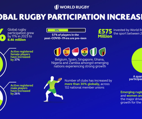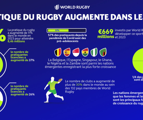 La participation augmente de 11 % pour se fixer à 8,4 millions de joueurs en 2023, le sport continuant à connaître une croissance accélérée après la pandémie mondiale ; 57 % des joueuses et joueurs de l'ère post-Covid-19 sont des préadolescents, dont 24 % de filles ; Près d'un quart des participants sont des femmes, avec un objectif stratégique de croissance ; World Rugby (https://www.WorldRugby.org) et les fédérations appliquent l'abaissement de la hauteur de plaquage dans le rugby amateur ; World Rugby investit 575 millions de livres sterling (670 millions d’euros) dans le développement du sport entre 2020 et 2023.