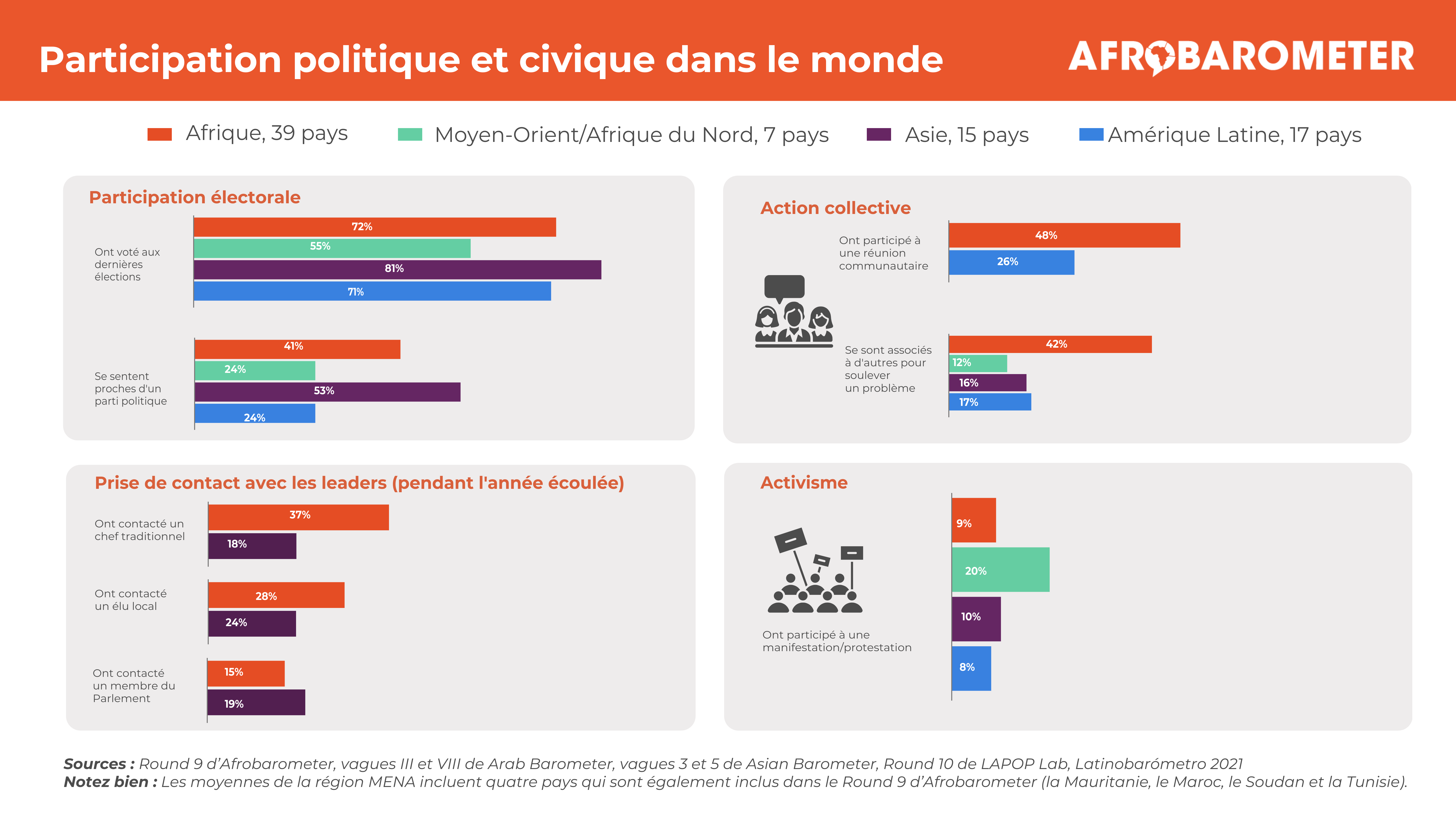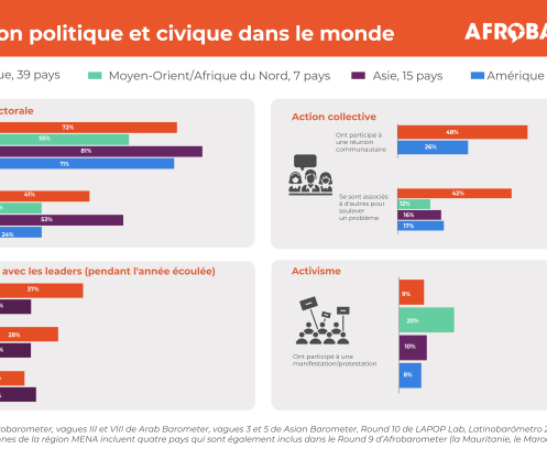 Afrobarometer (AB) est une source fiable de données et d’analyses de haute qualité sur ce que pensent les Africains. Avec un historique inégalé de plus de 400.000 entretiens dans 42 pays, représentant les points de vue de plus des trois quarts de la population africaine, AB mène la charge pour combler le déficit de données du continent. Les données de l’AB éclairent de nombreux indices mondiaux, tels que l’Indice Ibrahim de la Gouvernance Africaine, le Baromètre Mondial de la Corruption de Transparency International et les Indicateurs Mondiaux de Gouvernance de la Banque Mondiale. Les données sont également utilisées pour les analyses des risques pays et par les agences de notation et de prévision du crédit telles que l’Economist Intelligence Unit. Tous les ensembles de données d’AB sont accessibles au public sur le site Web (www.Afrobarometer.org/) et peuvent être analysés gratuitement à l’aide de l’outil d’analyse de données en ligne (https://apo-opa.co/46aBV1S) d’AB.