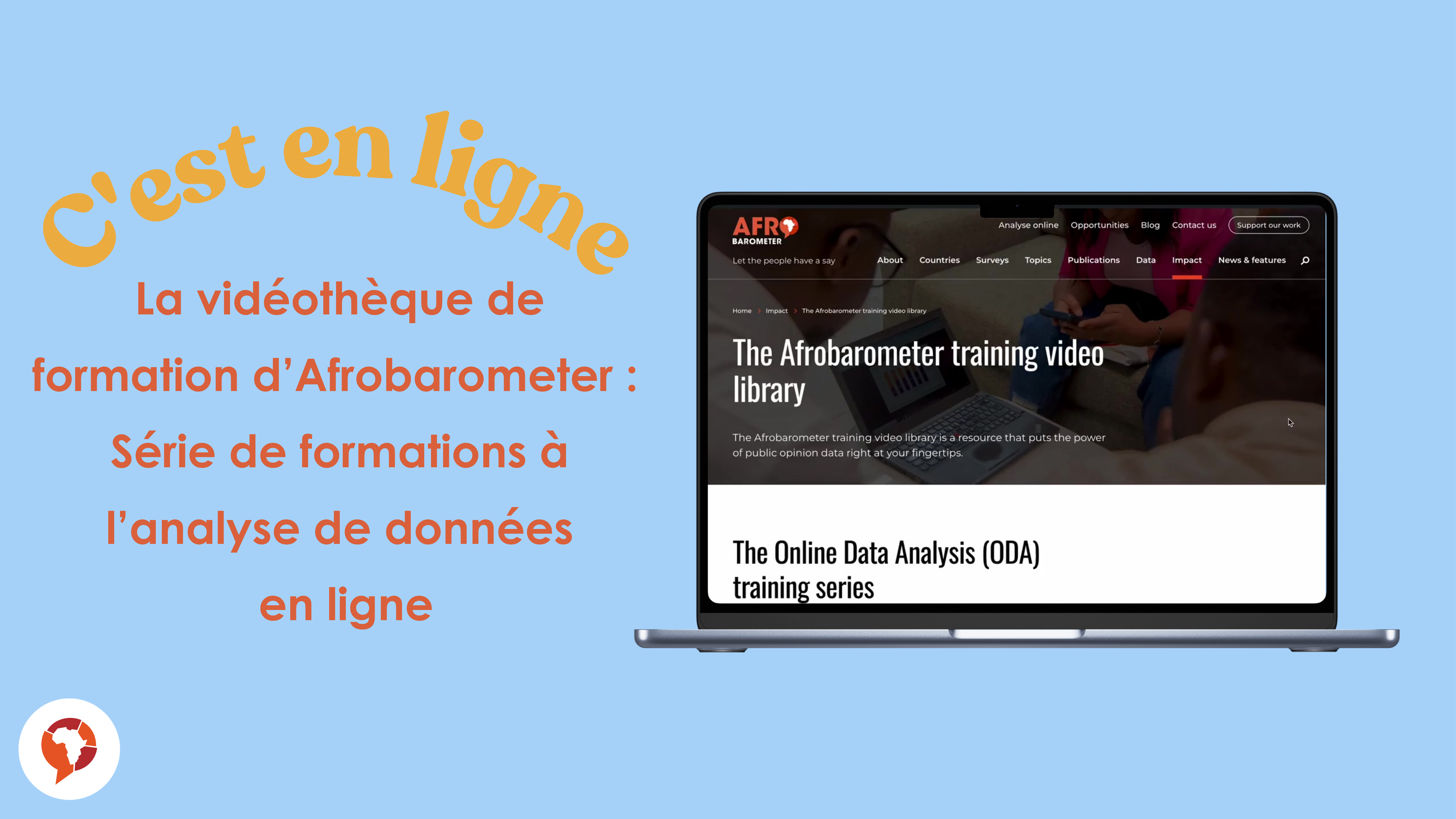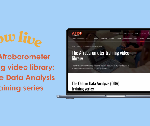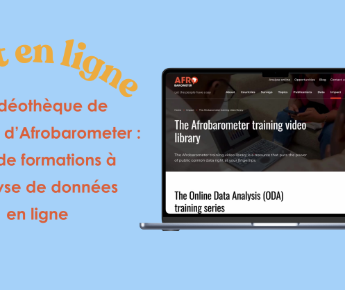 Afrobarometer (www.Afrobarometer.org) a lancé une vidéothèque de formation (https://apo-opa.co/4gAdmyX) virtuelle pour permettre à chacun – du gouvernement et de la société civile aux médias, aux étudiants et au grand public – d’accéder, de comprendre et d’utiliser ses données sur les expériences et les préférences des Africains.