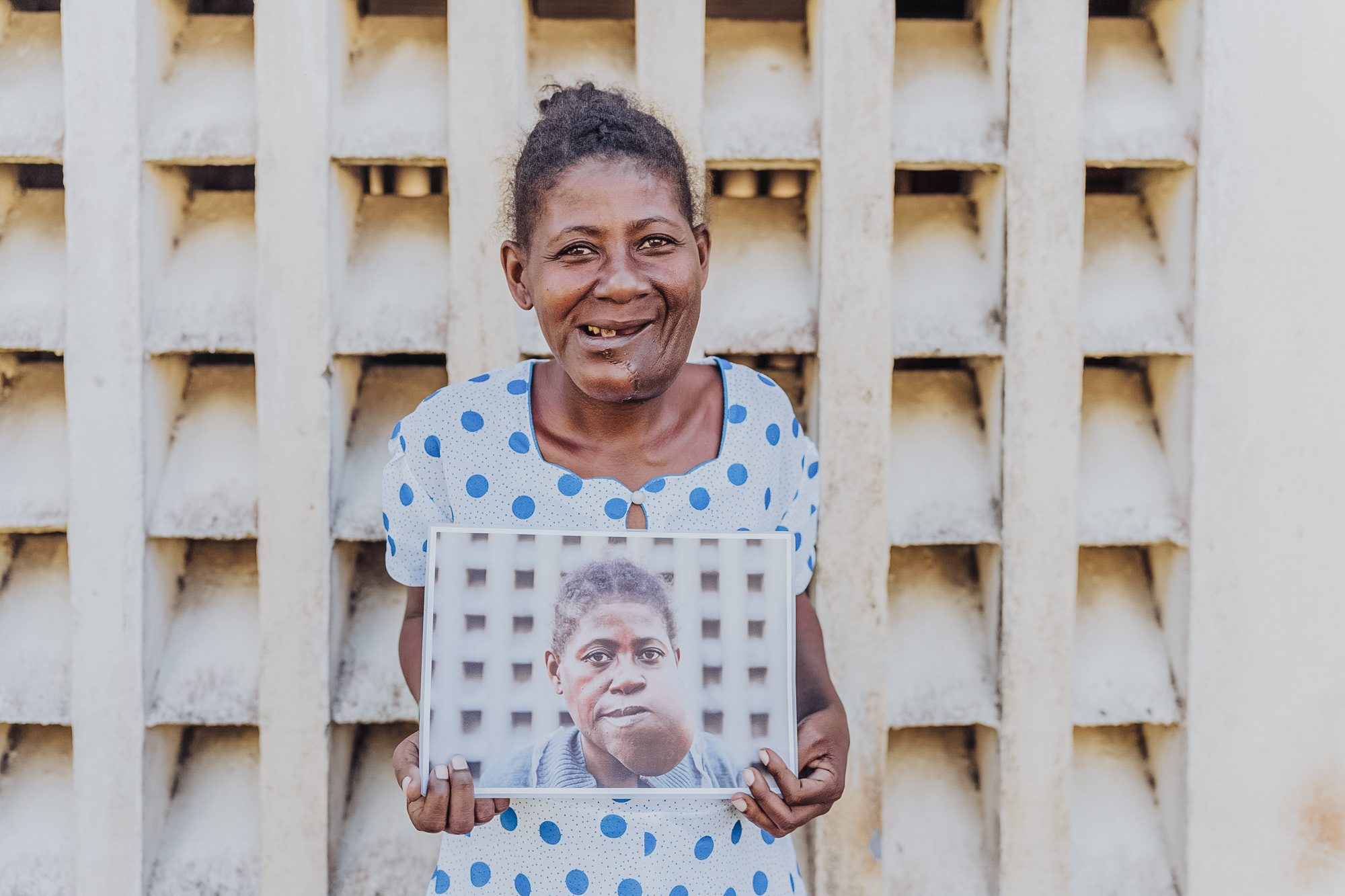 Theogette’s burden began as a severe toothache. The tooth was removed at a local clinic, but a small swelling appeared along her jaw and grew over time until it overwhelmed the entire lower part of her face. Superstitious rumors spread throughout her village until eventually her husband caved under the pressure and abandoned her. Left alone to raise her three children, Theogette continued working through her pain in the rice fields.