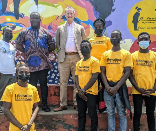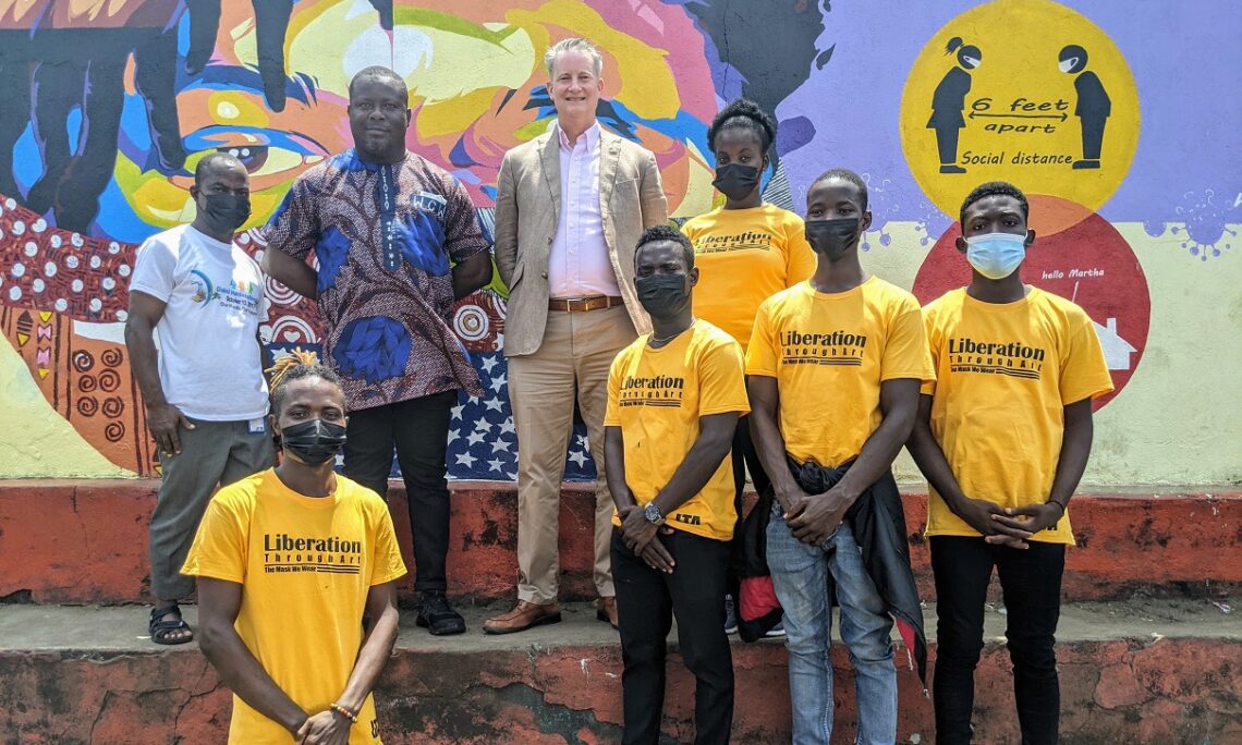 On Sunday, October 17, Ambassador Michael McCarthy and Sandra McCarthy visited the West Point township to view a new mural by Monrovian artist Patrick Gono and his team. The mural shows our shared fight against the COVID-19 pandemic and how to prevent a resurgence of it in Liberia.