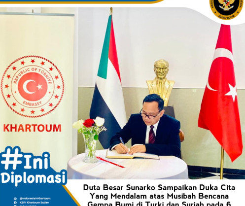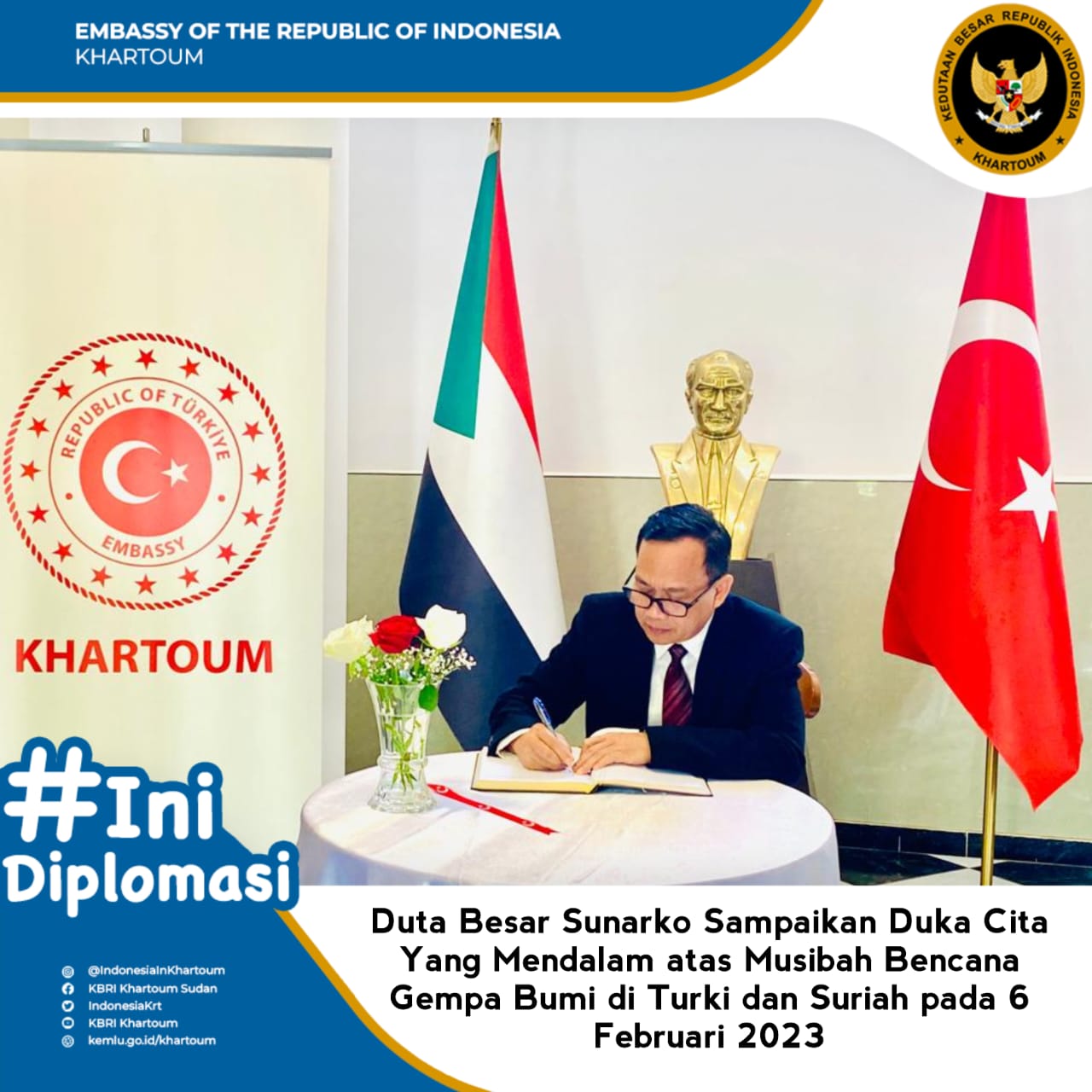 Ambassador Sunarko on Thursday (9/2) visited the Turkish Embassy and the Syrian Embassy in Khartoum to express his deep condolences and condolences for the earthquake that occurred in the southeastern region of Turkiye and the northern region of Syria on February 6, 2023.
