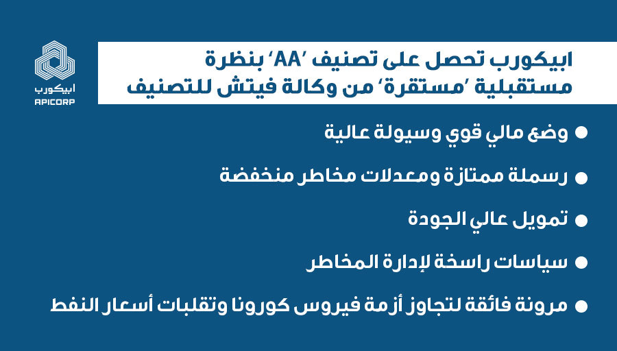 Les « perspectives stables » confirment la résilience du profil de crédit d’APICORP face aux pressions négatives exercées par la pandémie de COVID-19 et les fluctuations du cours du pétrole; cette notation est motivée principalement par les caractéristiques de crédit intrinsèques d’APICORP, son excellent taux de capitalisation, son faible profil de risque, la solvabilité élevée de ses emprunteurs et ses pratiques solides de gestion des risques; Fitch estime qu’APICORP dispose d’un accès « solide » aux marchés de capitaux et aux sources de liquidité alternatives; cette seconde notation fait d’APICORP le seul établissement financier de la région MENA noté « AA » par Fitch et « Aa2 » par Moody’s