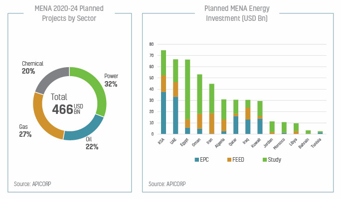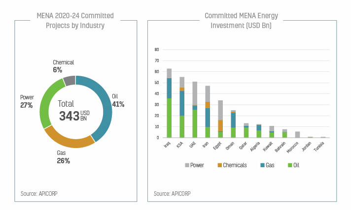 Le rapport MENA Energy Investments Outlook 2020 indique que les investissements énergétiques sont stimulés principalement par certains pays : les investissements de l’Arabie saoudite dans les secteurs du gaz et de l’électricité (39 milliards USD et 41 milliards USD, respectivement) ; les efforts de reconstruction et la conversion du gaz en électricité en Irak (33 milliards USD) ; la maximisation des capacités pétrolières des EAU (45 milliards USD) ; et la nouvelle dynamique pétrochimique en Égypte (38 milliards USD). En particulier, APICORP a porté la part du secteur privé dans les investissements en faveur de projets énergétiques à 19%, après l’avoir augmentée de 22% dans ses Perspectives de l’an dernier.