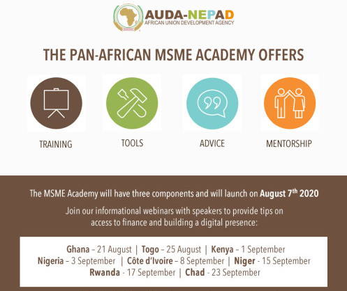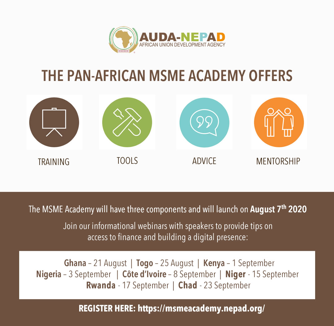 Les micros, petites et moyennes entreprises africaines sont invitées à participer aux webinaires d'information afin d'obtenir des conseils sur l'accès au financement et les stratégies de mise en place d'une présence numérique de la part des intervenants. L'inscription à l'Académie des MPME peut se faire ici : https://msmeacademy.nepad.org