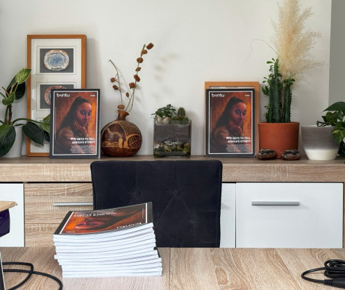 • Display of the inaugural edition of Bantu Gazette during the soft launch surrounded by elements that reflect its visual identity and editorial mission