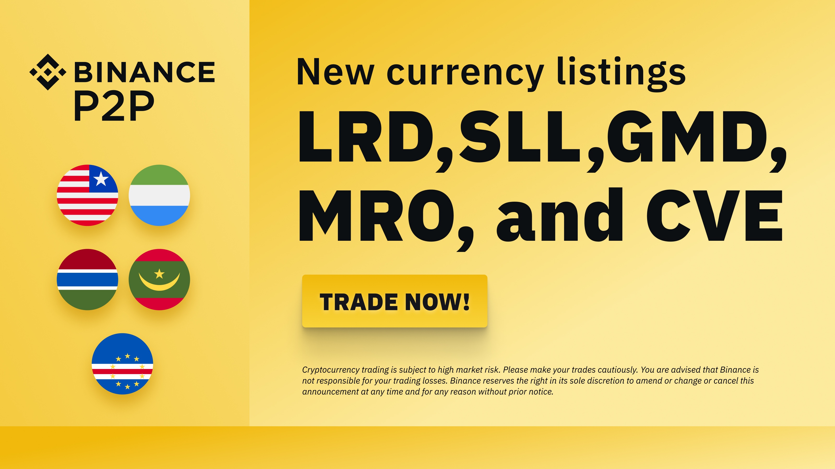 Les utilisateurs peuvent désormais négocier et publier des annonces de trading en LRD, SLL, GMD, MRO et CVE, ou négocier directement et sans frais en BTC, USDT, ETH, BNB et BUSD