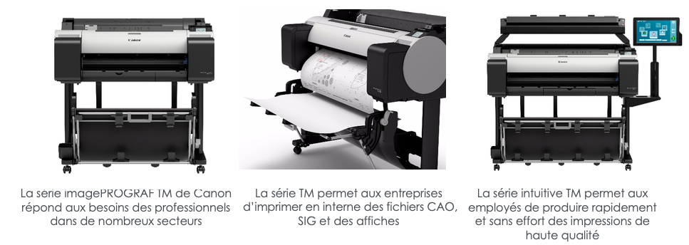 The imagePROGRAF TM Series has been designed to meet demand for a productive, robust, large format printer for business environments that require smaller volumes of high quality prints, with a compact footprint and less noise.