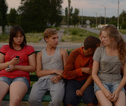 • Young adults from Chtchastia a town in the Donbass region are talking on a bench by Marion Pehee