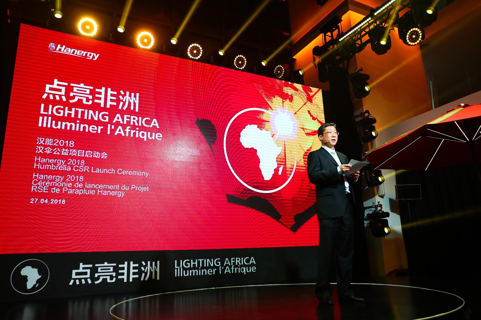 China Clean Energy Company, Hanergy Group (http://en.Hanergy.com), launched a solar powered umbrella dubbed “Humbrella”. The innovation, meant to light up African villages and provide a cost efficient and environmentally friendly solution compared to other sources of energy, was launched at a spectacular event on the 27th of April 2017 at the Hanergy Renewable Energy Exhibition Center, Beijing, China.