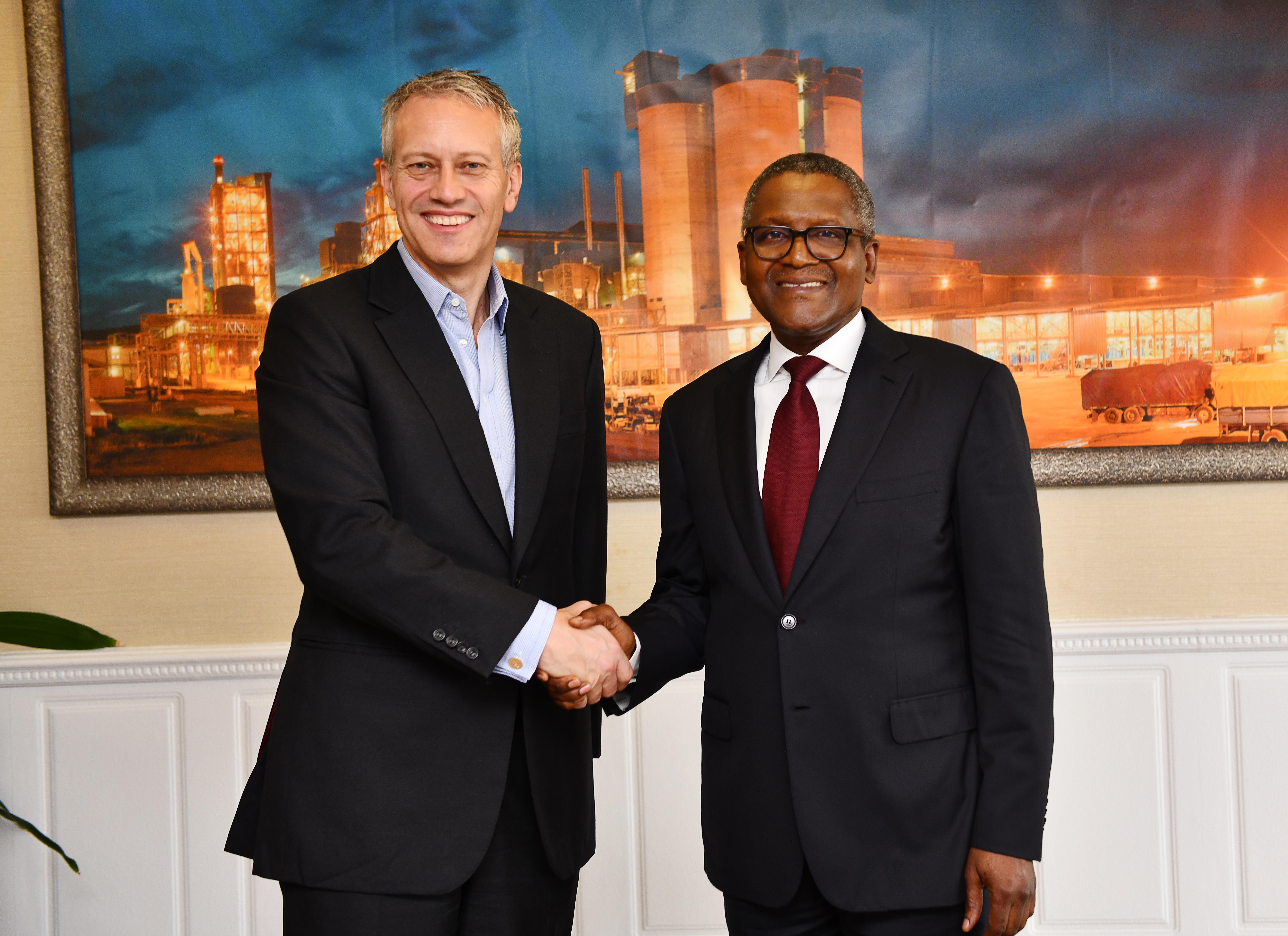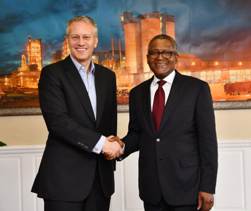 • James Quincey, président-directeur général de The Coca-Cola Company (à gauche) et Aliko Dangote, président du groupe Dangote, lors de leur récent engagement à Lagos
