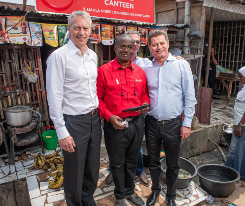 • James Quincey, président et chef de la direction de The Coca-Cola Company, représentant des ventes pour la Nigeria Bottling Company, et Zoran Bogdanovic, directeur général de Coca-Cola Hellenic, lors d'une visite de marché au Maryland de Lagos