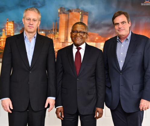 • L-R James Quincey, président et chef de la direction, The Coca-Cola Company; Aliko Dangote, présidente du groupe Dangote; et Brian Smith, président et chef de l’exploitation de The Coca-Cola Company lors de la récente visite à Lagos