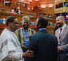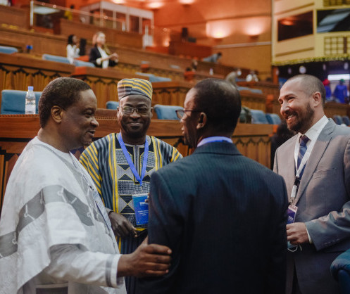 • Pierre M'Pele, chef du bureau Afrique de Mercy Ships, à gauche, s'entretient avec les délégués nationaux du Bénin, Thierry Mavoha, et Eugene Zoumenou avec le Dr David Ugai, directeur national de Mercy Ships pour la Guinée et membre du comité scientifique international au Symposium international pour accélérer l'accès à la chirurgie, Dakar, mai 2022'