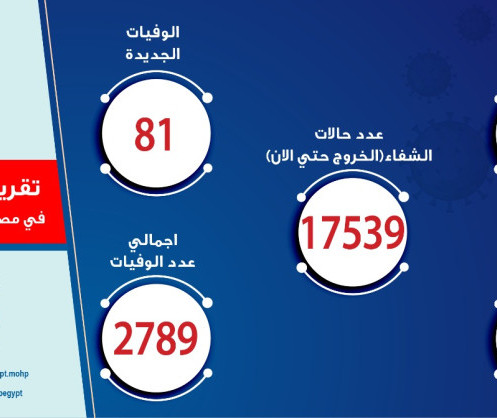 وذكر "مجاهد" أن إجمالي العدد الذي تم تسجيله في مصر بفيروس كورونا المستجد حتى اليوم الأحد، هو 65188 حالة من ضمنهم 17539 حالة تم شفاؤها، و 2789 حالة وفاة.