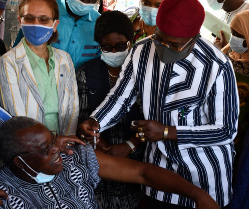 • Hippolyte OUNAGRAWA, comédien, metteur en scène reçoit sa dose de vaccin contre la COVID-19, administrée par le Ministre de la santé sous le Regard du Représentant de l’OMS et de l’UNICEF