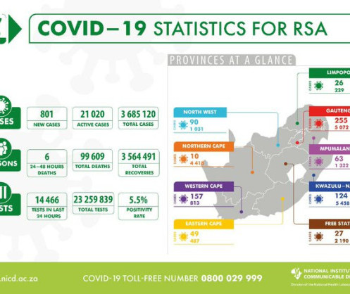21,020 tests were conducted in the last 24hrs, with 801 new cases, representing a 5.5% positivity rate. Today @HealthZA  reports 62 deaths; of which 6 occurred in the past 24–48 hours. Total fatalities are 99,609 to date.