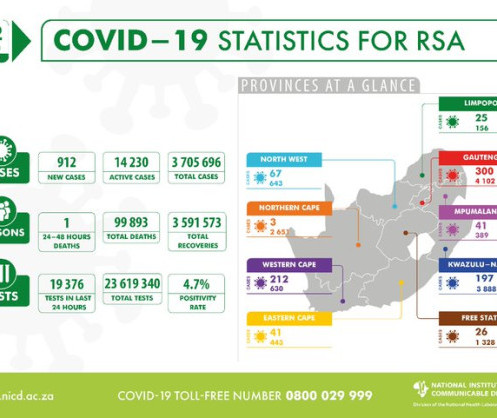 19,376 tests were conducted in the last 24hrs, with 912 new cases, which represents a 4.7% positivity rate. Today @HealthZA reports 1 deaths in the past 24–48 hrs. Total fatalities are 99,893 to date: ow.ly/BJJW50IprGL