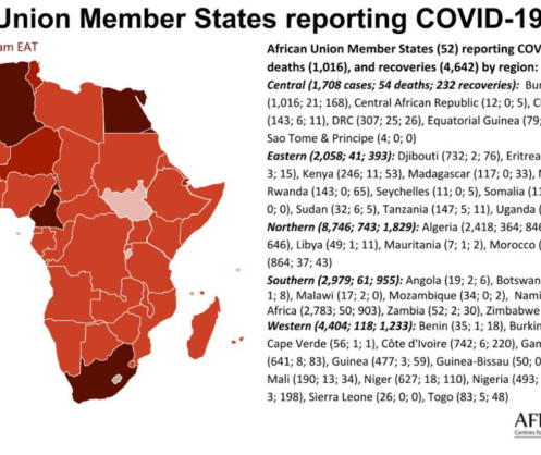 African Union Member States (52) reporting COVID-19 cases (19,895) deaths (1,016), and recoveries (4,642) by region: