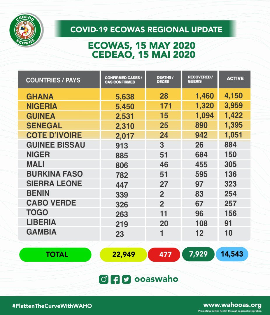 • Coronavirus - Africa: COVID-19 highlights in the ECOWAS region as at 15th May, 2020