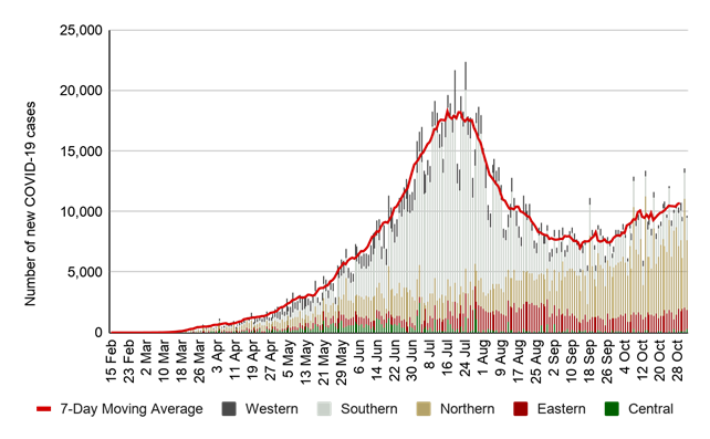• Nouveaux cas de COVID-19 signalés par jour et par région de l'UA, du 15 février au 1er novembre 2020