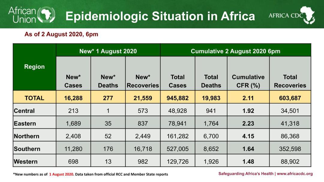 African Union Member States (55) reporting COVID-19 cases (945,882), deaths (19,983), and recoveries (603,687) by region: