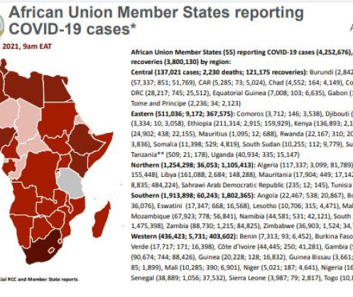 African Union Member States (55) reporting COVID-19 cases (4,252,676), deaths (113,429) and recoveries (3,800,130) by region: