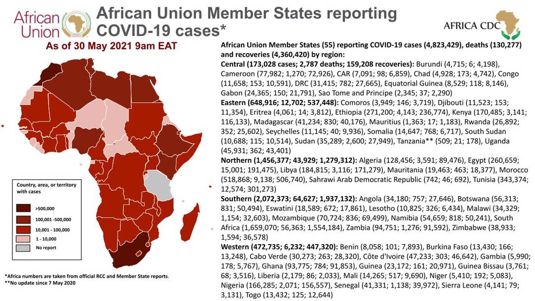 African Union Member States (55) reporting COVID-19 cases (4,823,429), deaths (130,277) and recoveries (4,360,420) by region: