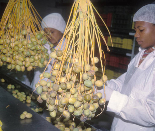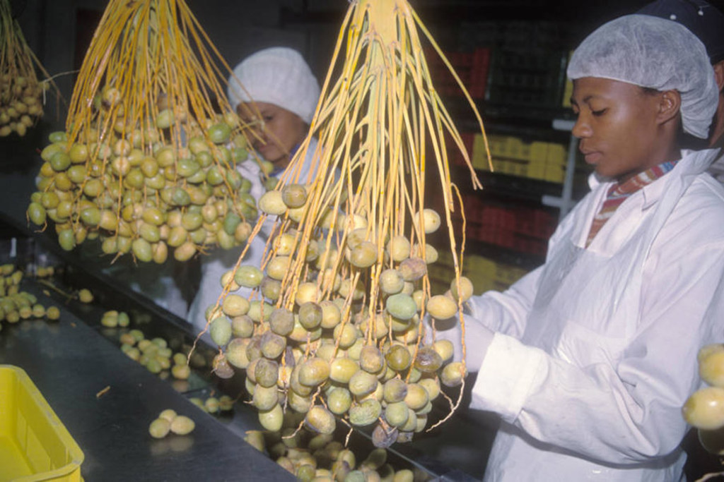 • En Namibie, des employés d'une usine emballent des dattes commercialisées pour l'exportation (FAO / M. Namundjebo)