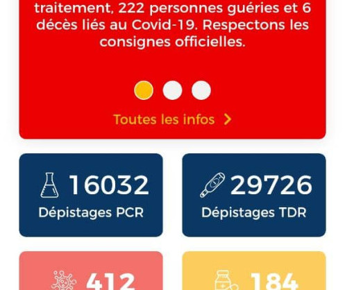 Le Bénin enregistre à la date du 11 juin 2020, un total de 412 cas confirmés avec 184 personnes sous traitement, 222 personnes guéries et 6 décès liés au Covid-19. Respectons les consignes officielles. Centre d'appel numéro 136 - https://gouv.bj/coronavirus/