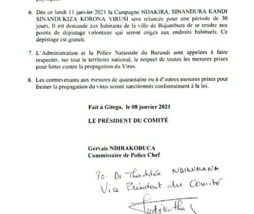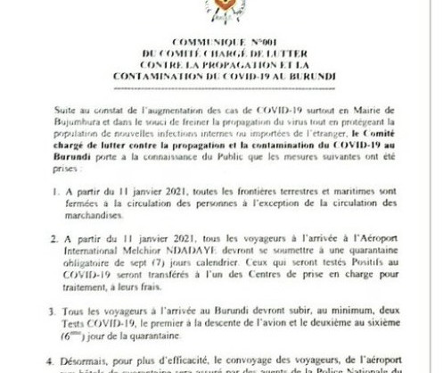 Communiqué du comité chargé de lutte contre la propagation et la contamination du COVID-19 au Burundi lu par le Ministre.