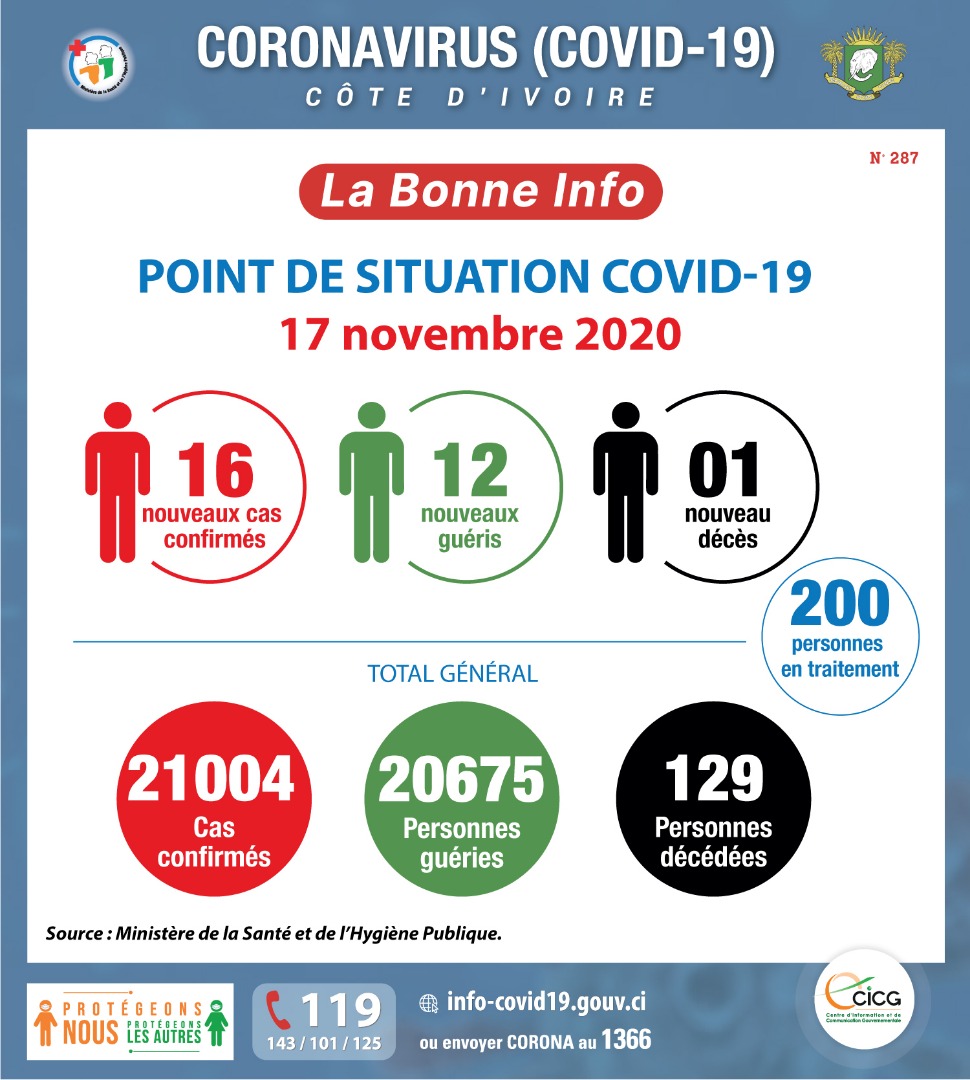 • Coronavirus - Côte d'Ivoire : Point de la situation COVID-19 du 17 novembre 2020