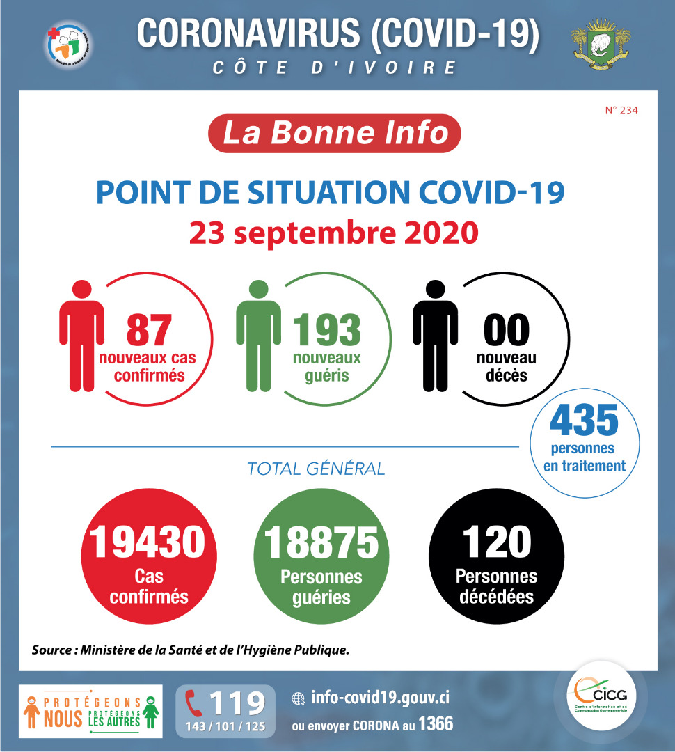 Coronavirus - Côte d'Ivoire : Point de la situation COVID-19 du 23 septembre 2020