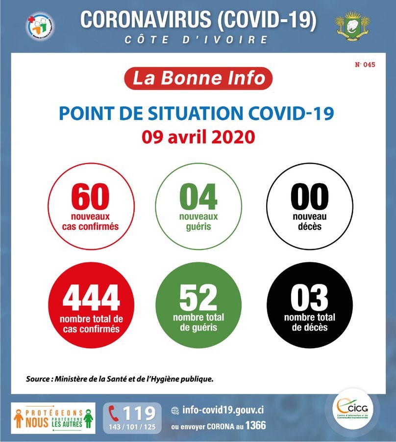Coronavirus - Côte d'Ivoire : Point de la situation COVID-19 du jeudi 09 avril 2020