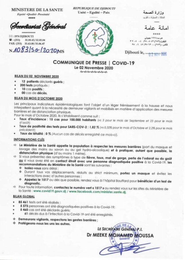 • Coronavirus - Djibouti : Point de Presse sur la Situation COVID-19 le 02 novembre 2020