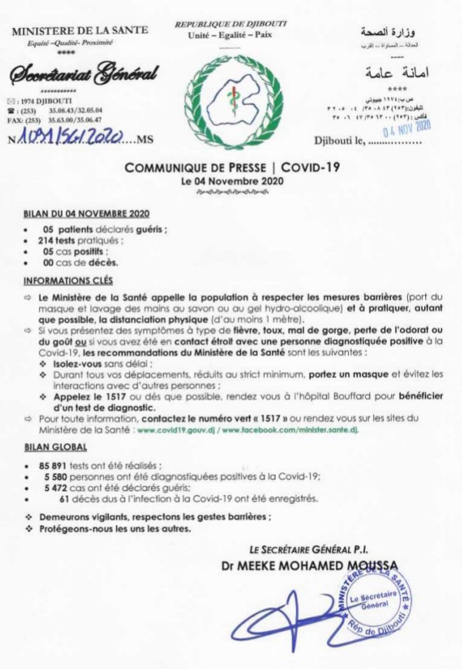 • Coronavirus - Djibouti : Point de Presse sur la Situation COVID-19 le 04 novembre 2020